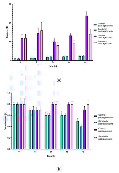 The results of the study demonstrated that bread crumb hardness increased after 72 h of storage in the control packaging and in the sandwich packaging. An increase in this parameter was not significant. Any influence of sandwich packaging on bread crumb hardness was not observed (Figure 4a). The differences between these parameter values were not found to be significant, and this was confirmed by statistical analysis (p > 0.05). Bread crust fillet hardness increased after being stored for 8 h in paper packaging and in sandwich packaging, with this parameter decreasing after 24 h. A modification of the packaging with NaCl as a water absorber and an Aquaseal coating as a water vapour barrier caused a smaller increase in bread crust hardness after 48 and 72 h of storage (Figure 4a). The differences between hardness values were found to be significant, and this was confirmed by statistical analysis (p < 0.05). As observed in Figure 4a, after 72 h of storage, bread crust hardness stored in the sandwich packaging was higher than bread crust hardness before storage, though the difference was slight. On the other hand, bread crust hardness stored in paper packaging was significantly (p < 0.05) higher than the bread crust hardness before 72 h of storage. The results confirmed that sandwich packaging had a clear influence on the improvement in bread freshness after 72 h of storage. An analysis of the hardness parameter suggests that the sandwich packaging could increase bread storage time. In the case of cohesiveness, it was observed that the average parameter value for breadcrumbs stored in the control packaging and in the sandwich packaging decreased after 24 h of storage (Figure 4b). After 48 h of storage, changes in breadcrumb cohesiveness was not observed. The average cohesiveness value of breadcrumbs stored in paper packaging, measured for the same samples, but stored for 72 h, increased, as well as the average cohesiveness value of the breadcrumbs stored in sandwich packaging. These changes were significant and confirmed by a two-way ANOVA test (p < 0.05). A decrease in this parameter was observed for samples stored in sandwich packaging and was greater than for the samples stored in paper packaging. The differences between the cohesiveness values of bread crust stored for 48 h (in both kinds of packaging) were not found to be significant, again confirmed by statistical analysis (p > 0.05). A significant decrease in this parameter was observed for samples stored for 72 h in paper packaging (control samples) (p < 0.05). After 72 h of storage, a significant decrease in bread crust cohesiveness for the samples stored in the sandwich packaging was not observed (p > 0.05).