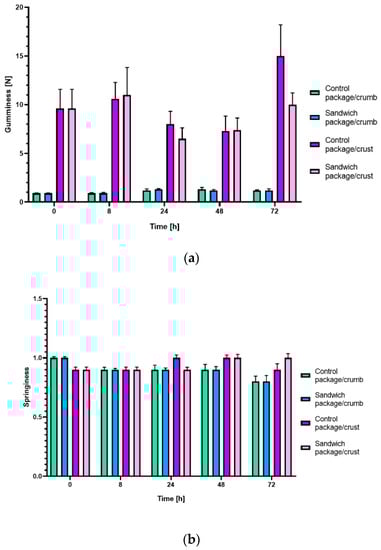 As emphasised below (Figure 5a), the gumminess of breadcrumbs stored in the paper packaging and in the sandwich packaging increased slightly after 72 h when compared to the ‘’0” sample. These changes were not significant (p > 0.05). It was demonstrated that both paper and sandwich packaging caused a significant decrease in this parameter after 24 h of storage, again, confirmed by statistical analysis (p < 0.05). After 48 h of storage, the average gumminess value of the bread crust stored in sandwich packaging increased when compared to the gumminess value of the samples stored for 24 h and decreased compared to the “0” sample. The opposite results were observed for samples stored in the paper packaging, a decrease of the gumminess value was observed after 24 and after 48 h of storage. Additionally, after 72 h of storage, the gumminess of the bread crust stored in the sandwich packaging showed a slight increase compared to the gumminess value obtained from the “0” sample. The differences between gumminess values were not significant, which was later confirmed by a statistical test (p > 0.05). Contrary to these results, a significant increase (p < 0.05) in the gumminess of the bread crust stored in paper packaging was observed compared to the gumminess value obtained from the “0” sample. The results of the study demonstrated that the springiness of breadcrumbs decreased after 72 h of storage in both paper and in sandwich packaging. These changes were significant and confirmed by a two-way ANOVA test (p < 0.05). In the case of bread crust, after 24 h, this parameter increased, but only for samples stored in paper packaging. After 48 h, the differences between springiness values were not observed (for both kinds of packaging). A modification of the paper with an Aquaseal coating and NaCl as water absorber caused a greater increase in bread crust springiness after 72 h of storage (Figure 5b). The differences between springiness values were found to be significant, and this was confirmed by statistical analysis (p < 0.05).