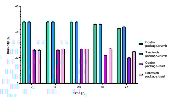The results of this study demonstrated that the humidity of the breadcrumbs was 48%. The storage of bread in the paper packaging and in the sandwich paper led to a decrease in the humidity of breadcrumbs to 46% after 48 h of storage and to 43% for samples stored in paper packaging and to 44% after 72 h. It was noted that the humidity of breadcrumbs stored in sandwich packaging was higher than the humidity of the samples stored in paper packaging. The results showed that the bread crust humidity was 26%. The storage of bread in paper packaging and in the sandwich paper led to an increase in the humidity of the bread crust to 27% after 24 h of storage. After 48 h, the humidity of bread crust decreased to 22%, but only for samples stored in paper packaging. After 72 h of storage, the humidity of bread crust decreased to 20% (for samples stored in paper packaging) and to 25% (for samples stored in sandwich packaging). It was noted that a decrease of the humidity of bread crust stored in paper packaging was significant, and this was confirmed by statistical analysis (p < 0.05). Paper packaging led to a decrease in the humidity of the bread crust. A humidity decrease was significantly lower for the samples stored in sandwich packaging (Figure 6).