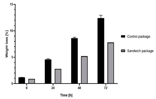 The results of the study demonstrated that the bread lost weight after 24, 48 and 72 h of storage. It was noted that the weight loss was significantly greater for the samples stored in the paper packaging than for the samples stored in the sandwich package (Figure 7).