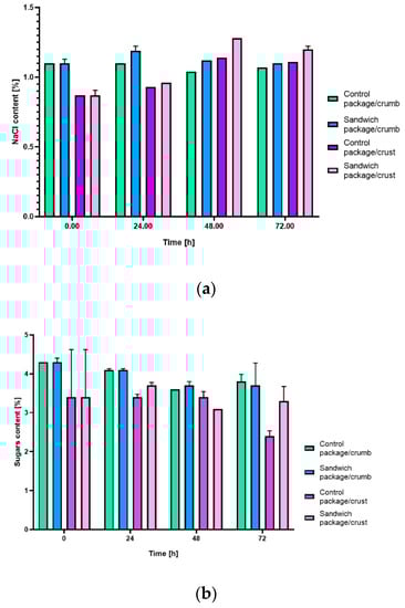 It was shown in the study that the salt content of the breadcrumbs and the bread crust did not decrease during 72 h of storage (Figure 8a). It was also observed that the amount of the salt in the crust increased after 72 h of storage, but the sandwich packaging did not influence the salt content in the bread as the differences between salt content values for samples stored in sandwich packaging and in paper packaging were not significant (p > 0.05). The results of the study demonstrated that the sugar content of the breadcrumbs decreased slightly after 48 and 72 h of storage. The influence of the packaging modification on sugar content in the crumbs was not noted (Figure 8b) and the differences between these results were not found to be significant (p > 0.05). In the case of the crust, a 1% decrease in the content of sugars was observed, but only for samples which were stored in paper packaging. The sugar content did not decrease in the case of samples stored in the sandwich packaging.