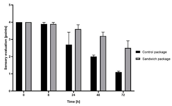 Fresh bread was characterised by a high sensory quality, showing a maximum score value of 4. After 24 h of storage, the score value decreased to 2.7 for bread stored in paper packaging, while in the case of bread stored in the sandwich packaging, this only decreased to 3.6 (Figure 9). After 48 h of storage, the influence of packaging modification on the sensory quality of bread was found to be higher. According to the sensory quality evaluation (Figure 9), paper packaging gave a strong objectionable smell and taste, and the scores fell dramatically after 72 h of storage (scores value 1.1), while sandwich packaging did not markedly decrease the sensory quality of the bread (a score value of 2.5). The differences between score values for bread stored in sandwich packaging and in paper packaging were found to be significant (p < 0.05).