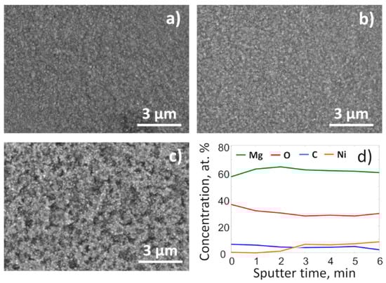 SEM surface images of Mg–Ni films: (a) as-deposited, (b) hydrided, and (c) after it was analyzed by in-situ XRD in the CO2 atmosphere. (d) XPS near surface region depth profile of the film presented in (c).