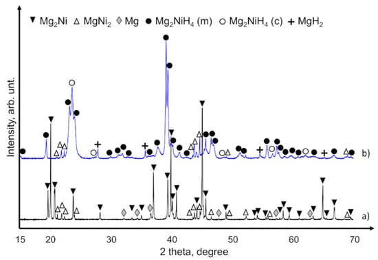 XRD patterns of commercial Mg2Ni powders that contained Mg and MgNi2 components are provided in Figure 4a. After hydriding these powders, the crystal phases of Mg2NiH4, MgH2, and MgNi2 were obtained (Figure 4b). The XRD patterns of the hydrided powders had no peaks of unreacted Mg and Mg2Ni phases, so we assume that the loss of hydrogen concentration (see DSC/TGA analyses below) was caused by the aggregative effect of hydrogen non-adsorbing phases like MgNi2. MgO was not observed by XRD, but we nevertheless assume that it also contributed to the lower hydrogen concentration because commercial Mg–Ni grains were delivered in an air-containing canister and had successive handling in air.
