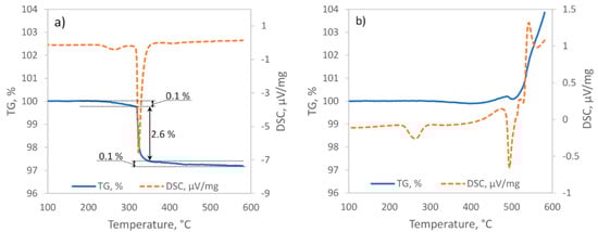 Differential scanning calorimetry (DSC) and TGA were performed with a NETZSCH STA 449 F3 Jupiter (Hamburg, Germany) analyzer with an SiC furnace. The heating program started at 45 °C and continued up to 580 °C at a heating rate of 10 °C/min. Argon gas (with a flow rate of 60 mL/min) was used as the inert atmosphere. The oxidizing environment consisted of carbon dioxide (with a flow rate of 25 mL/min) and argon (with a flow rate 35 mL/min). The TGA sample carrier with an S-type thermocouple was calibrated for 200 mg Al2O3 TGA crucibles. For each measurement, 8.4–8.8 mg samples were used.