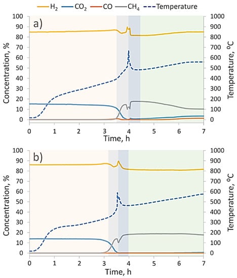 The CO2 methanation reaction dynamics at 1 and 10 bars of gas pressure are provided in Figure 6a,b, respectively. Both charts have temperature peaks that correspond to the fast decomposition of hydrides (Mg2NiH4 and MgH2) and the oxidation of Mg2Ni disproportionation products. After the heat burst, we found a new catalyst with substantially different properties.
