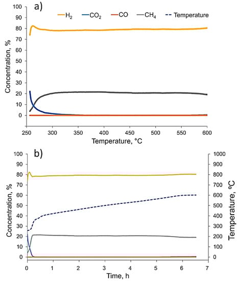 After considering the potential benefits of catalyst cycling after the first methanation run-up at 10 bars of pressure was finished, we gradually decreased furnace temperature down to 250 °C. During the cool-down period and 30 min after the target temperature was reached, the container was constantly flushed with hydrogen. Subsequently, the container was filled up with hydrogen to 10 bars of pressure and confined for 16 h at 250 °C. The next day, we repeated the methanation process (Figure 7) with same parameters as were used before (10 bars of pressure and H2:CO2 ratio of 6:1). This time, the methanation reaction started immediately at 250 °C (close to the lowest reported values [,]), reached a 100% CO2 conversion at 320–330 °C, and continued without the significant deterioration of CO2 conversion up to the maximum tested temperature of 600 °C. The CH4 yield at 500 °C was slightly higher and reached just over 80%. Looking at the methanation dynamics (Figure 7a), one can notice that there was no temperature burst or hydrogen concentration increase that could be attributed to the decomposition of Mg2NiH4 or MgH2 hydride. This suggested that during the first methanation experiment, Mg2NiH4 and MgH2 hydrides completely disproportionated, and only the MgO and Ni phases were formed. Accordingly, such a powder catalyst did not adsorb any additional hydrogen and was able to provide an enhanced performance after one just methanation cycle.