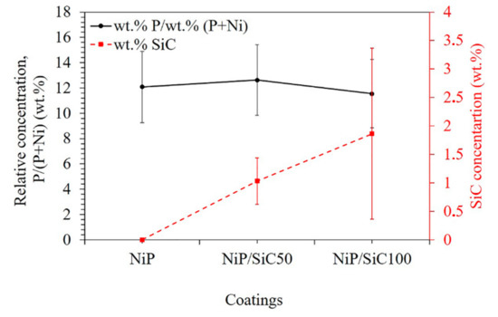 The previous study [41] showed that the composition of NiP coatings depends on the bath charge, and the EDS results in Figure 2 show that co-deposited the SiC 100 nm particles are much more scattered than the SiC 50 nm particles. The amount of co-deposited SiC 100 nm changed noticeably from one sample to another one, while for SiC 50 nm, it was approximately constant. In this study, co-deposition of SiC100 was more dependent on the bath charge than SiC50, which can be the reason for the scattered wt.% values. In addition, the difference between NiP/SiC50 and SiC100 can be due to the different batches or the differences in the manufacturing process, which can result in different surface properties of the particles.