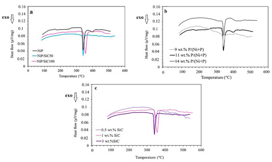 Differential scanning calorimetry (DSC) scans of (a) NiP and composite coatings with 11 wt.% P and 1 wt.% SiC, (b) NiP coatings with different P contents, and (c) NiP/SiC100 coating with different SiC contents.