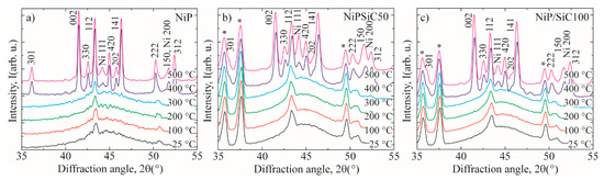 The XRD patterns of the NiP and composite coatings at room temperature and heat treated at different temperatures for 1 h are shown in Figure 4. At room temperature, all coatings demonstrated a broad diffraction peak centered around 2θ = 44.5°, corresponding to nanocrystalline Ni domains in an amorphous phase. By alloying Ni with high P, the Ni lattice distorts, which results in a disordered structure. The XRD pattern obtained for the as-plated NiP composite coating is similar to that of the pure NiP coating, confirming that co-deposition of SiC does not affect the coating crystallization in the as-plated state.
