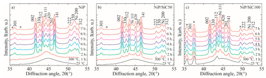 Isothermal X-ray diffraction (XRD) patterns of the (a) NiP, (b) NiP/SiC50, and (c) NiP/SiC100 coatings at 300 °C for different heating times.