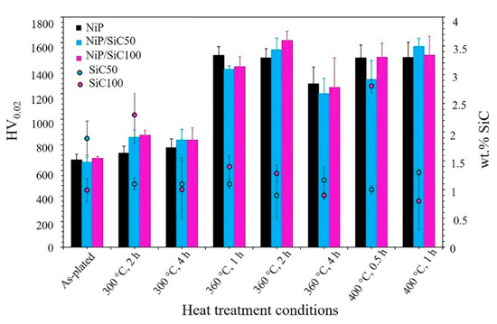 It is seen that the microhardness values of the NiP and composite coatings in as-plated and heat-treated conditions are similar (including the error bars). In addition, there is no clear relation between the SiC content and its size with respect to hardness values. Low co-deposition or agglomeration and uneven distribution of the SiC particles in the coating reduced their role in dispersion hardening, which was also observed by Chou et al. [43]. However, the role of the particles in hardening can be seen by heating at 300 °C for 2 h, where they encourage faster precipitation, as confirmed by XRD results (Figure 5).