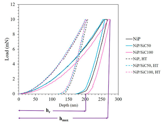 Nanoindentation was carried out on the cross-section of these coatings to study the influence of SiC particles as well as heat treatment (360 °C for 2 h) on the mechanical properties of the matrix. Figure 7 shows the typical load versus depth curve of as-plated and heat-treated coatings, in which residual depth (hr) and maximum depth (hmax) are shown. As-plated coatings exhibit similar hr and hmax values of approximately 190 and 265 nm, and through heat treatment, hr and hmax were reduced to about 130 and 200 nm, respectively. The lower residual depth of heat-treated coatings indicates their higher hardness. Moreover, there is a displacement in the as-plated coatings during the pause time at the maximum load, which is a bit higher for NiP than the composite ones, while this displacement was not seen in the case of heat-treated coatings.