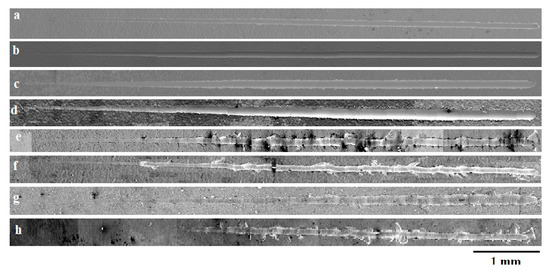 A scratch test with a progressive load (0–8 N) was used to check the wear resistance and coating adhesion to the substrate. Coating adhesion influences their wear resistance and poor adhesion results in blistering, flaking, or peeling of the coating. Figure 8 shows the scratch tracks on the NiP and NiP/SiC100 coatings. NiP/SiC50 had similar scratch tracks to those of NiP/SiC100; therefore, its scratch track is not shown here. As seen in Figure 8, as-plated and heat-treated coatings at 300 °C for 2 h demonstrated smooth scratch tracks (plowing, Figure 9a). Heat treatment at 360 °C for 2 h or 400 °C for 1 h resulted in the formation of cracks inside the scratch track as well as through the coatings. By increasing the normal load, elastic and plastic deformation increased until damages such as cracks occurred in the coating, which is known as a cohesive failure. Finally, detachment of the coating from the substrate happened, indicating adhesive failure. The failure modes in the scratch test depend on several factors, such as surface roughness, the hardness of both substrate and coating, test load, the indenter radius, the coating thickness, the residual stress in the coating, and the interfacial adhesion [49].