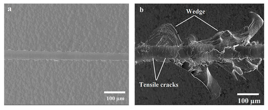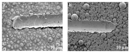 According to the observation reported in Figure 8, the scratch track in the heat-treated coatings (360 and 400 °C) developed tensile cracks as well as wedge spallation (Figure 9b). Tensile cracks are formed due to the induced tensile stress at the back of the indenter when it scratches along the coating. The tensile-based failure occurs as a result of a brittle coating deposited on a ductile substrate, which was also seen by Gyawali et al. [50]. In the case of a relatively hard coating on the soft substrate, if the coating thickness is higher than 10 µm, the bending and the buckling failure modes are not observed, while initially, compressive shear cracks form ahead of the indenter through the coating thickness. These cracks propagate to the surface and interface, and forward movement of the indenter drives the wedge and interfacial crack propagation. The cracks’ propagation from both sides of the scratch track develops at around 45°, which is in line with the maximum shear stress direction.
