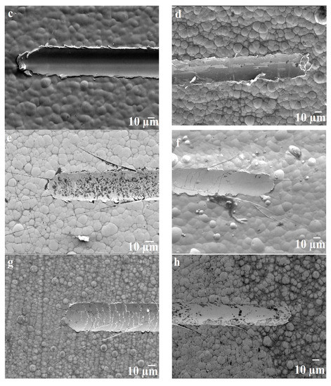SEM images of the ends of scratches produced at a constant load of 4 N: (a,b) as-plated, (c–h) heat treated, (c,d) 300 °C, 2 h, (e,f) 360 °C, 2 h, (g,h) 400 °C, 1 h; (a,c,e,g) NiP, (b,d,f,h) NiP/SiC100.