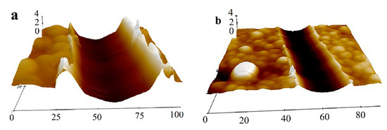 Figure 10 shows the SEM images of the ends of scratches produced at a constant load of 4 N on the NiP and NiP/SiC100 coatings. At a constant load of 4 N, the as-plated and heat-treated coatings at 300 °C (2 h) demonstrated smooth scratch tracks without any cracks, while after heating at 360 °C (2 h), cracks formed inside the scratch track and extended to the coatings around the scratch track as well. By comparing the NiP and NiP/SiC100 scratches, it is clear that NiP/SiC100 had fewer cracks, especially after heating at 400 °C (Figure 10g,h). In addition, NiP/SiC100 has fewer cracks after heating at 400 °C than the one heated at 360 °C. To confirm these results, an AFM was used, and the scratches profiles were examined.