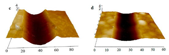Atomic force microscope (AFM) map of the scratch tracks of (a,c) NiP and (b,d) NiP/SiC100: (a,b) as-plated and (c,d) heat-treated at 400 °C for 1 h (all units in µm).