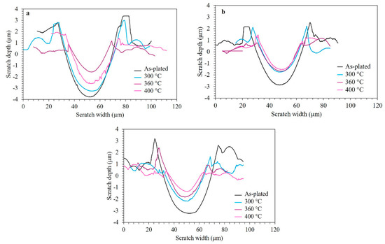 Scratch profiles at 4 N normal load of the as-plated and heat-treated (300 °C for 2 h, 360 °C for 2 h, and 400 °C for 1 h) coatings: (a) NiP, (b) NiP/SiC50, and (c) NiP/SiC100.