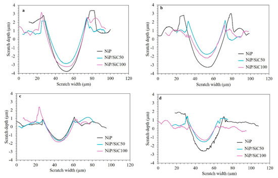 Figure 13 compares the scratch profiles of NiP and NiP/SiC50 as well as NiP/SiC100 in different conditions. Narrower and shallower scratches can be seen for composite coatings with respect to the pure NiP ones, and a noticeable difference between the samples happened by heating at 300 °C for 2 h or 400 °C for 1 h (Figure 13b,d). The better scratch resistance of composite coatings at 300 °C than that of the NiP one can be related to their higher hardness. However, even with comparable hardness at 400 °C, the scratch resistance of the composite coatings is better than that of the NiP one.