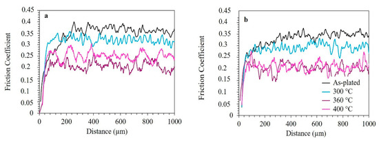 Figure 14 illustrates the variation in the friction coefficient with respect to the scratch distance for as-plated and heat-treated coatings. The friction coefficient did not change by adding SiC 50 or 100 nm, while it decreased with heat treatment. Moreover, the friction coefficient was higher in the as-plated condition for all coatings, and it reached a stable value after 240 µm sliding, while in heat-treated coatings, the friction coefficient became stable after 80 µm. Therefore, different running-in behavior was also observed through the crystallization of NiP coatings. The increase of the friction coefficient in as-plated conditions can be attributed to the mutual contributions from the adhesion between the coatings and plowing of the coatings by the hard scratch indenter [56,57].
