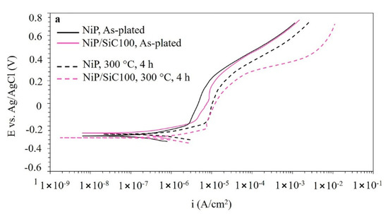 To evaluate the corrosion behavior of the coatings, they were immersed in 3.5% NaCl solution, and after 20 min, their anodic polarizations were investigated. Figure 15a shows that the NiP and composite coatings have similar polarization behaviors, both as-plated and heat treated at 300 °C. In both conditions, the coatings showed passive behavior, and by increasing the heating time to 4 h (Figure 15a), there was no significant change in the polarization behavior of these coatings. However, the passive range decreased in the case of heat-treated samples, and especially for the composite coating. NiP/SiC 50 and 100 nm had similar polarization behaviors, and therefore, the results of one of them are plotted in this study.