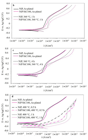 Polarization behavior of NiP and composite coatings: as-plated or heat treated at (a) 300 °C for 4 h, (b) 360 °C for 1 h, (c) 360 °C for 4 h, and (d) 400 °C for 0.5 h and 1 h.