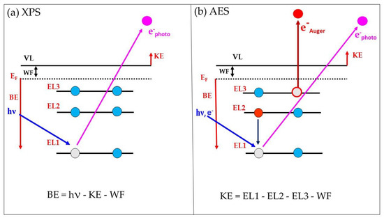 where KE is the kinetic energy of emitted Auger electron; EL1 is the binding energy of the first atomic level, where the hole is created (by X-rays or electron beam); EL2 is the energy of the second level from which the electron is falling down to the lower level EL1; and EL3 is the energy of the third atomic level from which the Auger electron is ejected. Of course, in some chemical elements the last two levels of the Auger process can be located in the valence band, where a core–valence–valence (CVV) Auger peak is then observed. Typical examples of such elements with broad Auger CVV peaks are carbon and silicon. A schematic diagram of the final state in photoemission and Auger excitations is illustrated in Figure 1.
