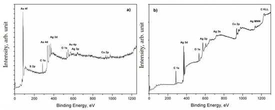 The study of surface analysis was performed on gold and silver collection coins supplied by the Kunsthistorisches Museum in Vienna (historical Austrian Ducat) and Austrian Mint (coins and their blanks). XPS, AES, and SAM techniques were combined to get qualitative and quantitative information about the surface defects. Their stains, analysed by a stereomicroscope, were generally composed by a dark central area surrounded by a larger outer area, whose colour varied from red to dark blue []. The chemical composition of every single stain was determined by XPS. All elements in the spot were quickly identified by the assignment of the peaks found in the survey scan spectrum (Figure 2), whereas their chemical state and atomic concentration were determined by processing the resolved spectra of the main peaks presented in Figure 3 [].