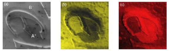 As it is possible to see from Figure 26a, the grains size of γs is about 100 µm, while the dimension of the transformed areas is much smaller, at about 10 µm. A traditional XPS apparatus is not adequate for us to study the chemical composition of the transformed zones with sufficient resolution because it can analyze only surface areas between 0.1 and 1 mm. For this reason, it was necessary to use a scanning photoelectron microscopy (SPEM) operating in both imaging and spectroscopy modes. Indeed, this type of analysis can use an X-ray microprobe with a diameter less than 100 nm.