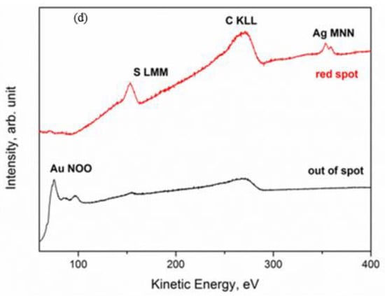 The obtained results promptly evidenced a strange composition of the stains on a pure (999.9) gold coin: A contamination with Ag and S was revealed. This was an astonishing finding for a pure gold coin, giving rise to the following questions: how and when had these impurities been added? The obtained results were confirmed by the multipoint AES analysis and SAM chemical maps acquired with a higher lateral resolution of approximately 200 nm, which are presented in Figure 4.