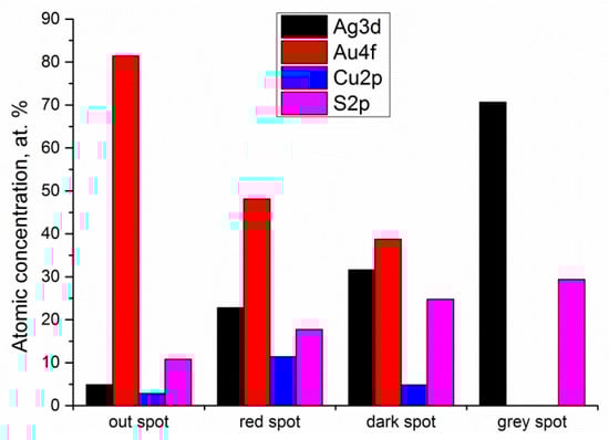 It is interesting to note that the XPS quantitative analysis identified four different scenarios, depending on the color of the spot, which are summarized in Figure 5: (1) grey stains—with Ag, O and S; (2) dark spots—with Ag, O, and S, but also with Au and Cu; (3) red spots—like the grey spots, but with different atomic concentration of the elements; and (4) clean surface—with Au, Cu, and a small amount of O.