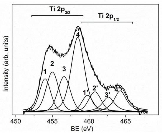 Hard coatings, based on transition metal nitrides or carbides, are characterized by excellent mechanical properties, suited for steel protection and fabrication of cutting tools. Their performance is continuously improved by the optimization of the fabrication processes, the development of new deposition technologies, and the production of composite materials with enhanced physical and chemical properties. An important contribution to the development of these coatings can be given by the use of surface analysis, which enables us to find the best production conditions and to improve their quality. In this section, the results obtained by the XPS and AES investigations of the TiN-Ti composite and a multilayer CrN–Cr coating are presented. As it can be seen in Figure 6, the deconvolution of the Ti 2p spectrum shows the presence of multiple contributions due to the different chemical states of Ti: the components 3 and 4 located at BE = 458.5 and 456.5 eV were assigned to the chemical states of Ti4+ and Ti3+ bound to oxygen; the component 1 positioned at BE = 454.1 eV was related to metallic Ti (0); finally, the component 2 positioned at BE = 455.0 eV was assigned to the bonds of Ti–N and Ti–C [,].