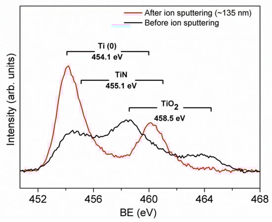 Comparison of the Ti2p signals acquired before and after Ar+ ion sputtering [].