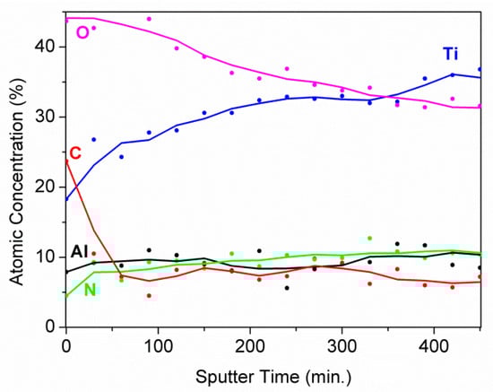 XPS depth profile of the Ti/TiN composite coating. The average sputtering rate was equal to 0.3 nm·min−1 [].