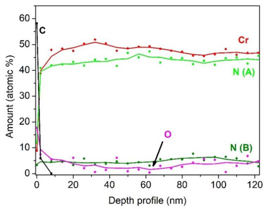 XPS depth profile of the first CrN layer in composite coating. The average sputtering rate was equal to 0.3 nm·min−1 [].