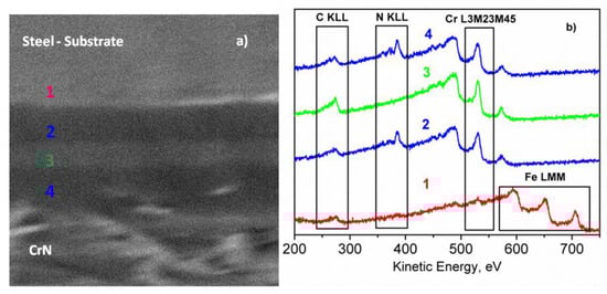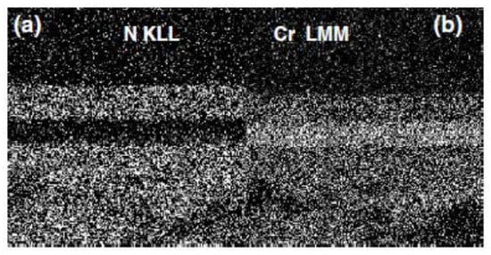 Figure 11 shows the SEM image and the multipoint AES analyses carried out on the cross section of the sample. The AES spectra were acquired on different points, moving from the substrate (region 1) to the top of the coating (region 4). The substrate was characterized by the presence of Fe LMM peaks (KE = 594.0, 652.0 and 705.7 eV) and the low-intensity KLL peaks of C and O (see Figure 11b). In Regions 2 and 4, the peaks of Cr L3M23M45 (KE = 530.6 eV) and N KLL (KE = 385.4 eV) were registered, whereas in Region 3, only a peak of Cr L3M23M45 was present. In addition, the chemical maps were acquired by SAM, where the investigated area of the sample was represented by pixels of the peak-minus-background intensity of the selected Auger peak. The SAM images collected by using the peak-minus-background of the Cr L3M23M45 and N KLL peaks are shown in Figure 12. The black points indicate the area without signal, whereas the lighter grayscale points indicate the area where the signals were detected. As it can be noticed, the layers are well-defined, and the interface is rather neat, suggesting the absence of diffusion phenomena during the deposition process. The coating thickness, estimated from the SEM/SAM images, was about 4.0 μm.
