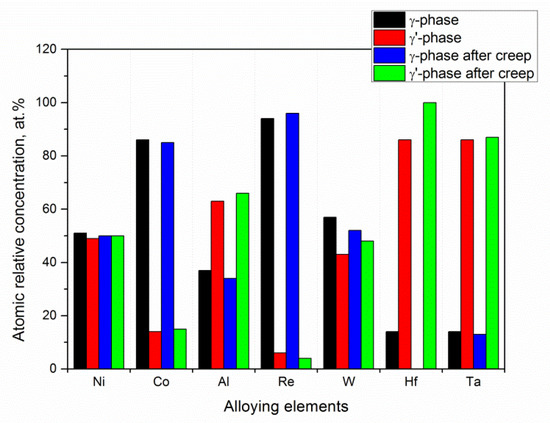 After the creep test, their distribution remained almost the same. On the contrary, the amount of Al and Ta was predominant in the γ′ phase, remaining unchanged after the creep test. Significant differences were found for W and Hf, where the creep test induced a migration of these elements from the γ phase to γ′ phase. The obtained results evidenced that this diffusion process is responsible for the weakening of the disordered matrix during the creep.