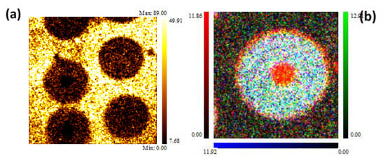 XPS images: (a) Ti 2p—400 × 400 µm2; (b) Si 2p (blue), C 1s—190 × 190 µm2, carbide (green) and graphite (red) [].