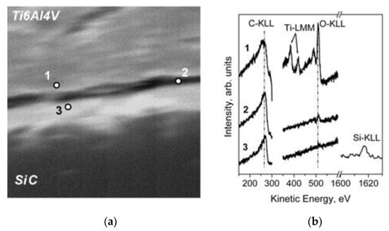 The XPS chemical maps were acquired by collecting the intensity of the signals positioned at BE = 458.8 eV (Ti 2p3/2), BE = 529.0 eV (O 1s), BE = 99.9 eV (Si 2p), and the intensity of C 1s, where the contributions of graphite (BE = 284.6 eV) and carbide (BE = 283.0 eV) were separated. As it can be seen, the fibers were embedded in the Ti6Al4V matrix, which the surface contained oxidized Ti species due to the reaction with atmospheric oxygen. The layer of titanium oxides was promptly removed after a brief time of ion sputtering, reducing the Ti chemical state to metallic one. Unfortunately, the lateral resolution of the standard XPS imaging (>3 µm) was too low for us to investigate the diffusion processes that can occur at the interface matrix/fiber. Therefore, the investigation at a higher lateral resolution was performed by an AES multipoint analysis. SEM images and AES line scan spectra acquired for Samples 1 (as prepared) and 2 (heated for 1000 h at 600 °C) are displayed in Figure 18 and Figure 19, respectively.