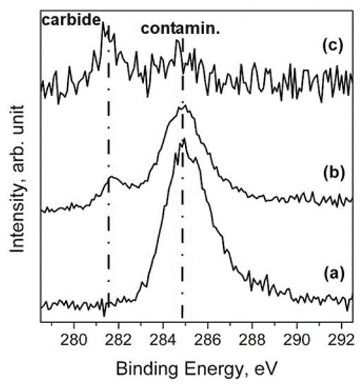 Comparison of C 1s spectra of the (a) as-prepared Ti 99.99+ sample; (b) Ti 99.99+ sample after 30 min of thermal process at 500 °C; (c) Ti 99.99+ sample after 140 min of ion sputtering at 1 keV [].