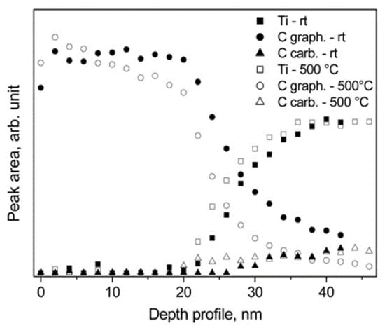 XPS depth profiles of the Ti 99.99+ sample covered with carbon at room temperature (rt) and after heating at 500 °C [].