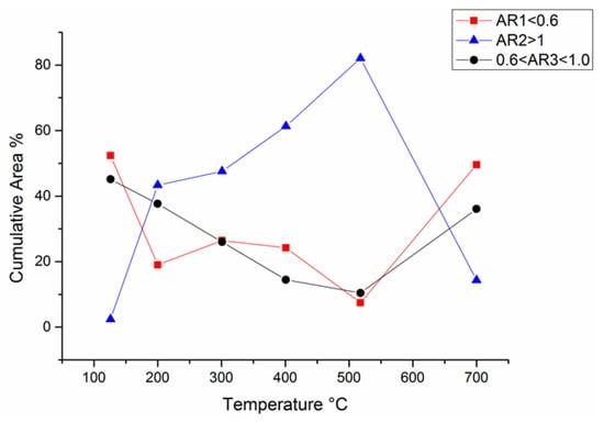 Cumulative area (CA) vs. quenching temperature for the three ranges of atomic ratio (AR): the values of AR1, AR2, and AR3.