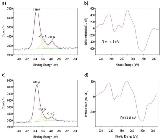 Because it is not possible to distinguish between the graphite and graphene (both peaks are positioned at BE of about 284.5 eV) from the C 1s photoemission spectra, the Auger spectra of C KLL were also acquired. In fact, from the calculation of the D parameter, i.e., the distance between the absolute maximum and the absolute minimum of the first derivative of C KLL spectrum [], it is possible to identify the presence of graphene []. Therefore, the value of D parameter was determined from the C KLL spectra induced by an X-ray source (XAES) and then it was compared with the same parameter obtained by using excitation with an electron gun (AES).