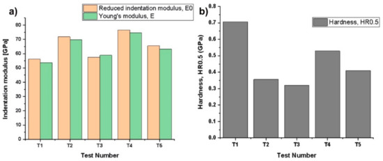 Indentation modulus (a), and HR0.5 microhardness (b).