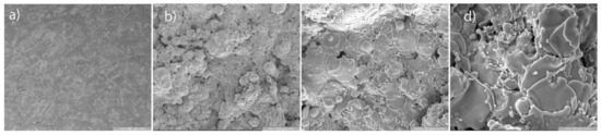 Images of surface SEM analysis of the base material and coated samples are presented in Figure 3. The base material microstructure is composed of evenly distributed α-ferrite (darker) and perlite (lighter) grains (Figure 3a). The AMDRY1371 powder coated surface possesses a morphology characteristic to the APS deposition process, with splats, pores, and rare partially melted powder particles (see Figure 3b,c). It must be noticed that the semi-melted light spherical particles are of Mo (Figure 3c), as proved by these EDS results and confirmed by [19]. At high magnification of 5000× (Figure 3d), the increased molybdenum content (over 75%) formed a flake-like microstructure, which may protect the surface during the dry running-in period of the tribological tests.