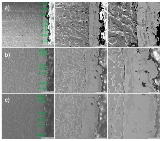 Figure 4 contains the results of the cross-section SEM analysis, transversal to surface coating, for all the samples, at various magnifications. The left side of Figure 4 presents measurements of the thickness of coatings, with the mean thickness values obtained from six equidistant measurements being: 5L = 58.8 µm, 7L = 82.5 µm, and 9L = 100.0 µm.