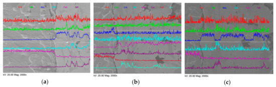 EDS line analysis over cross-sections for (a) 5L; (b) 7L; (c) 9L (for details, see Supplementary Material, Figures S1–S3).
