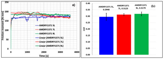 At the beginning of the tests (Figure 7a), the friction torque of sample 5L was less than that of 7L and 9L, but it undertook an ascendant trend as the thinner coating was removed by abrasion. Its dynamic evolution in the range of 1000–2000 s is supposed to be due to the direct contact between the AISI 52100 surface of the counterpart test roller and the base material surface. Thicker coatings presented a constant linear evolution of the friction torque (9L), and descendent evolution for sample 7L. The lowest coefficient of friction (CoF) was obtained for sample 5L, but the CoF values increased slowly for the thicker coatings—7L and 9L. The evolution of the 7L friction coefficient was as generally expected, with a typical curve being indicated in [33]. Regarding the obtained values of CoF, around 0.3, they are better than those reported by Dilawary et al. [21], who found values of CoF increasing from 0.4 to 0.9, for tests at room temperature on PTA deposited Mo(10%)-NiCrBSi and a sliding distance of 500 m.