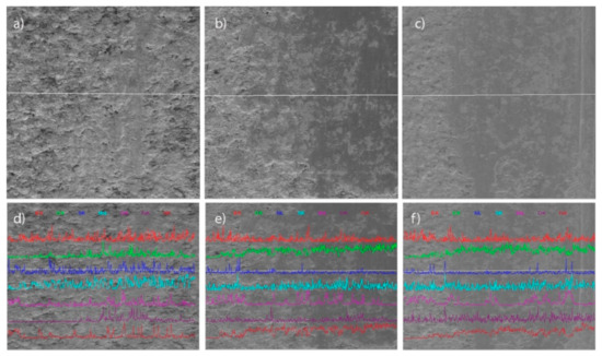 EDS line analysis over the worn surfaces: SEM images (50×) of EDS line direction for (a) 5L; (b) 7L; (c) 9L, and EDS line analysis for (d) 5L; (e) 7L; (f) 9L (for colors see Supplementary Material, Figures S4–S6).